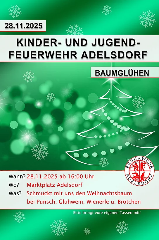 Liebe Kinder und Jugendliche, liebe Familien, am Freitag, 28. November 2025 von 16 bis 17:30 Uhr dürft ihr wieder gemeinsam mit der Adelsdorfer Kinder- und Jugendfeuerwehr den Weihnachtsbaum am Marktplatz schmücken.