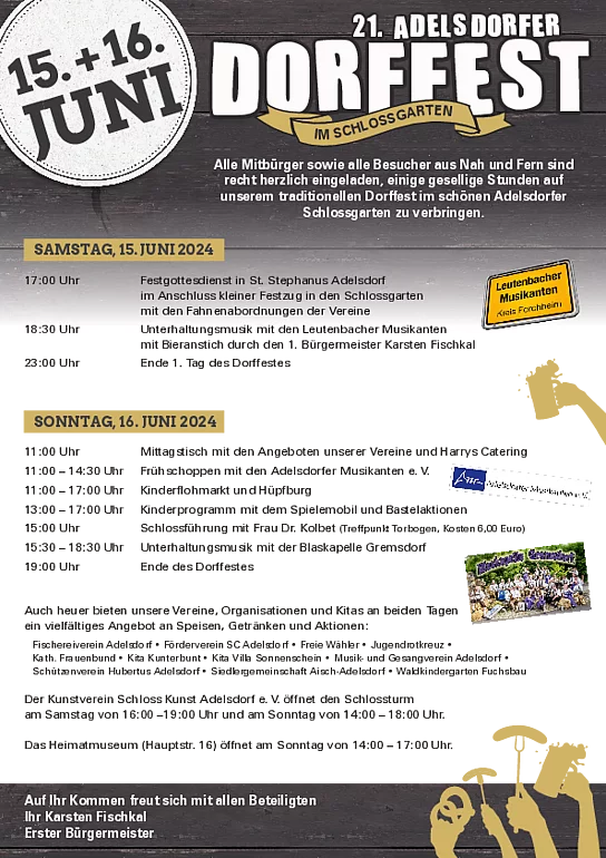 am Wochenende 15./16. Juni 2024 ist es wieder soweit: Wir feiern unser 21. Dorffest im schönen Ambiente des Adelsdorfer Schlosses.