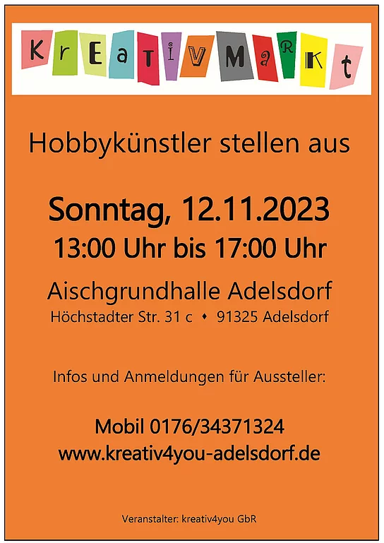 Informationen telefonisch unter 0176/34371324 (ab 18:00 Uhr) oder per Mail an kreativ-adelsdorf(at)gmx(dot)de.