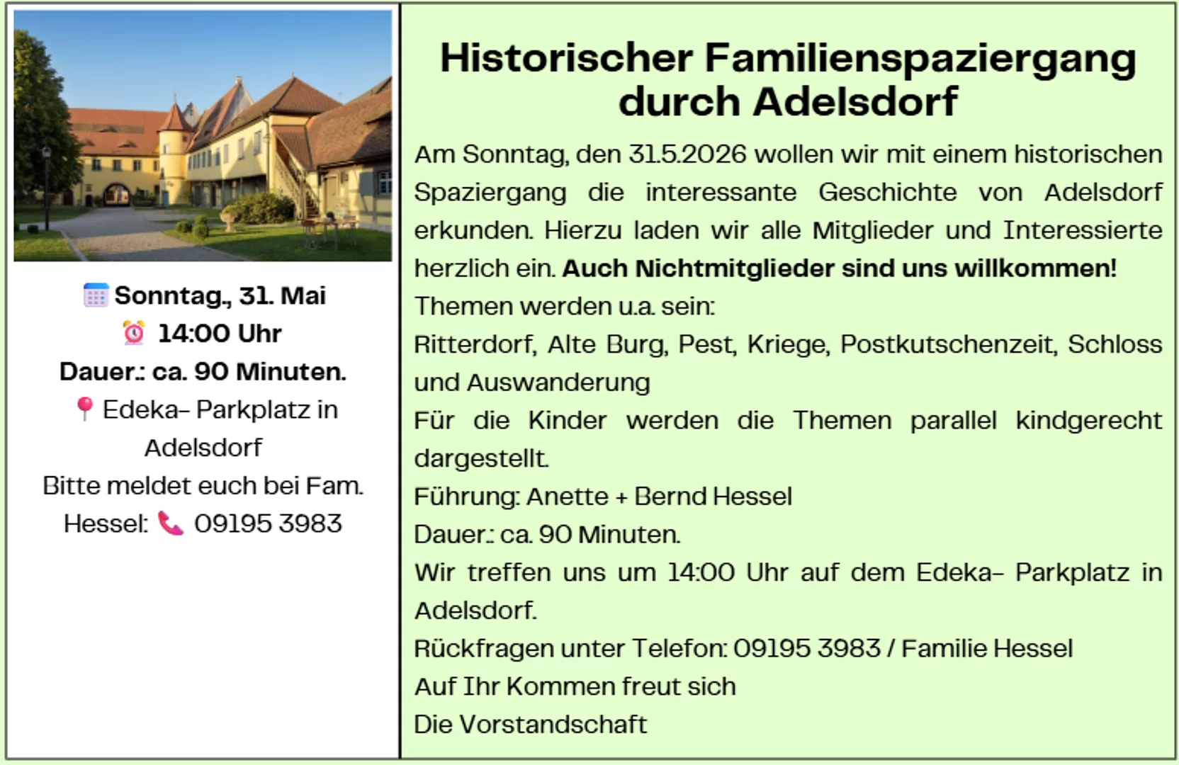 Geschichte von Adelsdorf erkunden. Hierzu laden wir alle Mitglieder und Interessierte herzlich