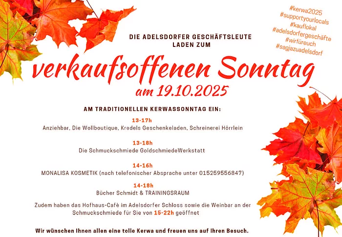 Für den Veranstaltungskalender schicken Sie uns bitte einen aussagekräftigen Text und ein schönes Foto oder einen Flyer an: redaktionsteam@adelsdorf.de
