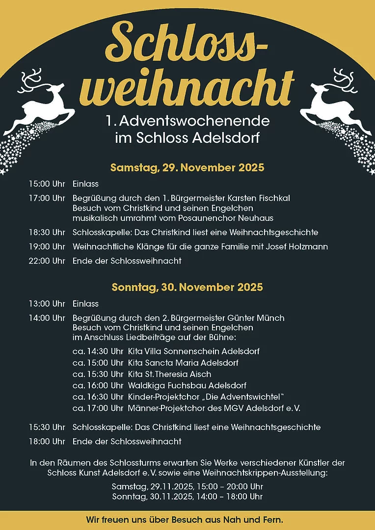 am ersten Adventswochenende 29./30. November 2025 ist es endlich wieder soweit: die traditionelle Schlossweihnacht findet im wunderschönen Ambiente unseres Adelsdorfer Schlosses statt.