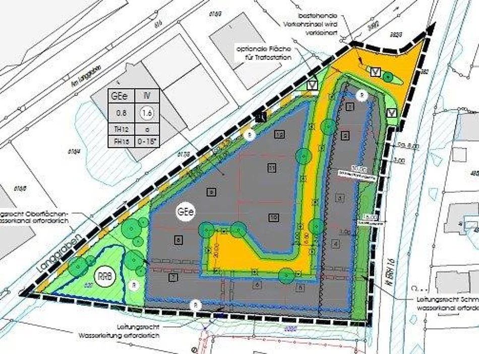 Zulässig sind Gewerbebetriebe aller Art, Lagerhäuser und -plätze, Geschäfts-, Büro- und Verwaltungsgebäude. Als Dachformen sind Flach- und Satteldächer mit einer Dachneigung von 15° möglich. Die Dachflächen sind mit einer Dachbegrünung zu versehen und/oder mit PV-Anlagen auszustatten.