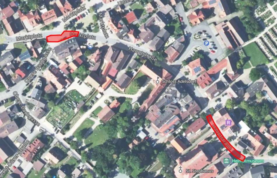 Der zweite Abschnitt des Nahwärmeausbaus auf der Hauptstraße beginnt in KW 20 auf Höhe des Heimatmuseums. Hier endet auch die Zufahrtsmöglichkeit für Kraftfahrzeuge in Richtung Marktplatz. Die hier markierten Bereiche sind nicht befahrbar.