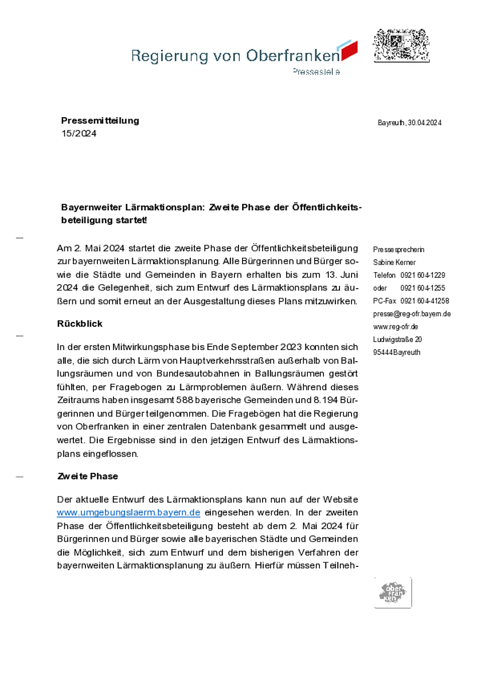 Die 2. Phase der Öffentlichkeitsbeteiligung startet am 02.05.2024 und endet am 13.06.2024. In diesen 6 Wochen können sich die Bürger und Gemeinden zu den Ergebnissen der 1. Phase der Öffentlichkeitsbeteiligung, sowie dem aktuellen Entwurf des Lärmaktionsplans (PDF) äußern. Die Ergebnisse fließen dann in den finalen Lärmaktionsplan ein, der an dieser Stelle bis Ende Juli 2024 veröffentlicht werden soll.